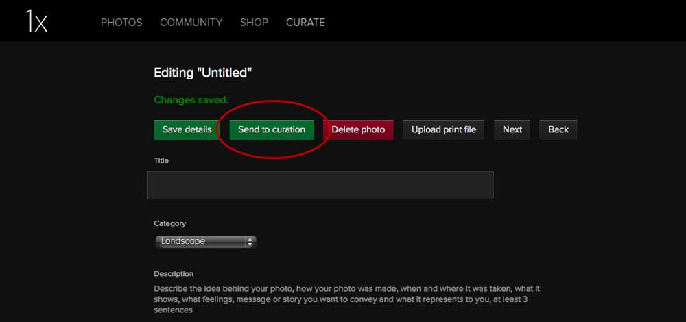 To submit a photo for curation, you can select "submit to the curators" either in the cog wheel menu or on the "photo details" page.