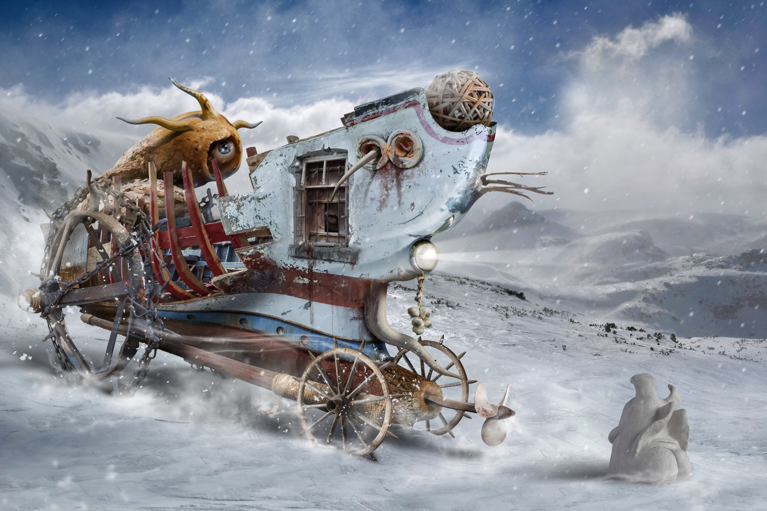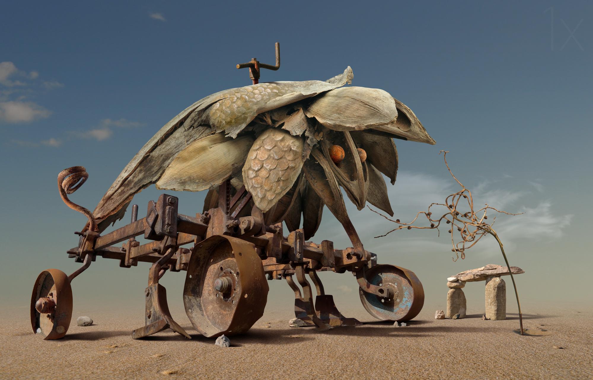 Sometimes I wish the workflow was shorter, but usually that doesn't happen. I have managed to finish 2 works within a month, but others take a year. It depends on inspiration, desire and incentive to work. When I have enough cut out photo details ready I start combining them together to create the main object. Then if I'm happy with the result I start making the auxiliary objects or creatures. This shapes the composition and the interaction between them. Finally comes the turn of the background or environment, light, shadow, etc. I use parts of many photos to get a strange and fantastic world.