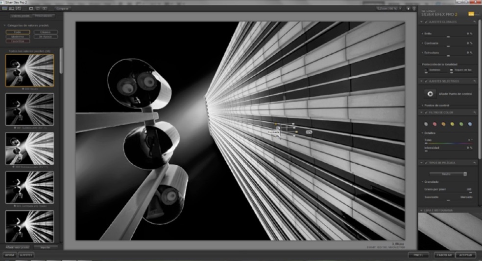 2) In Photoshop, I opened the image in Nik Silver Efex Pro 2 plugin. I usually apply the first two presets: 000 Neutral and 001 Underexposed (EV –1). In this case, I used the Neutral preset and then under Global Adjustments, I decreased Brightness (–8) and increased Contrast (+4). It is very important to add Control Points: I tend to use a total of 9 points (3 at the top of the photo, 3 in the middle and 3 at the bottom). It's also very important to increase the Brightness and the Contrast in those Control Points using values between +10 and +30, but do not adjust the Structure settings at this stage because it might spoil the final result.